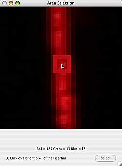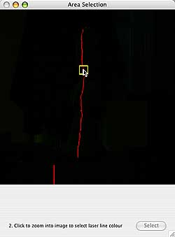 Navigate to a bright part of the laser line, and click the mouse once to select the colour. You will see the RGB colour breakdown at the bottom of the window. If you want to change your colour selection. use the yellow square to select another part of the image, and repeat the colour selection process. Click the Close button to return to the preview window. Scan Z